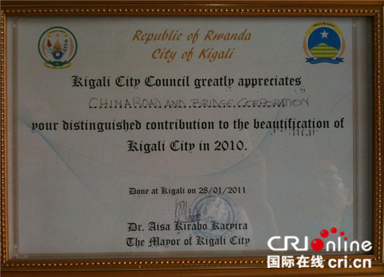 中国路桥承建的卢旺达基加利市政36公里项目获得“美化城市杰出贡献奖”。